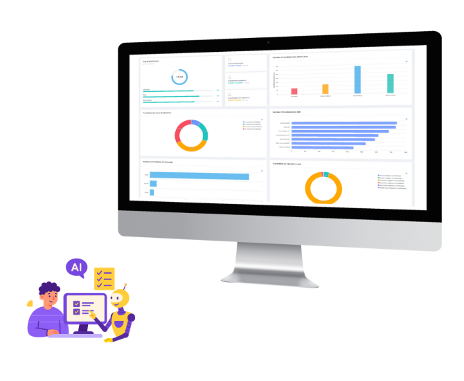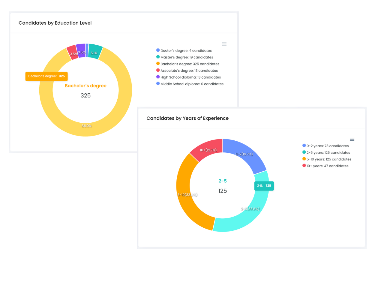 All insights are visualized in dynamic dashboards—no manual spreadsheets or reports required. Recruiters can filter by job, talent pool, date, or location, and drill into details with a single click.