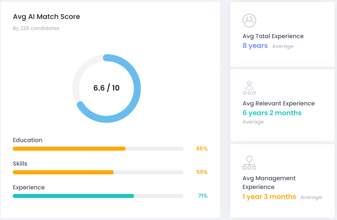 - Average AI Score: A quick, aggregated score of screening factors (experience, skills, etc.).